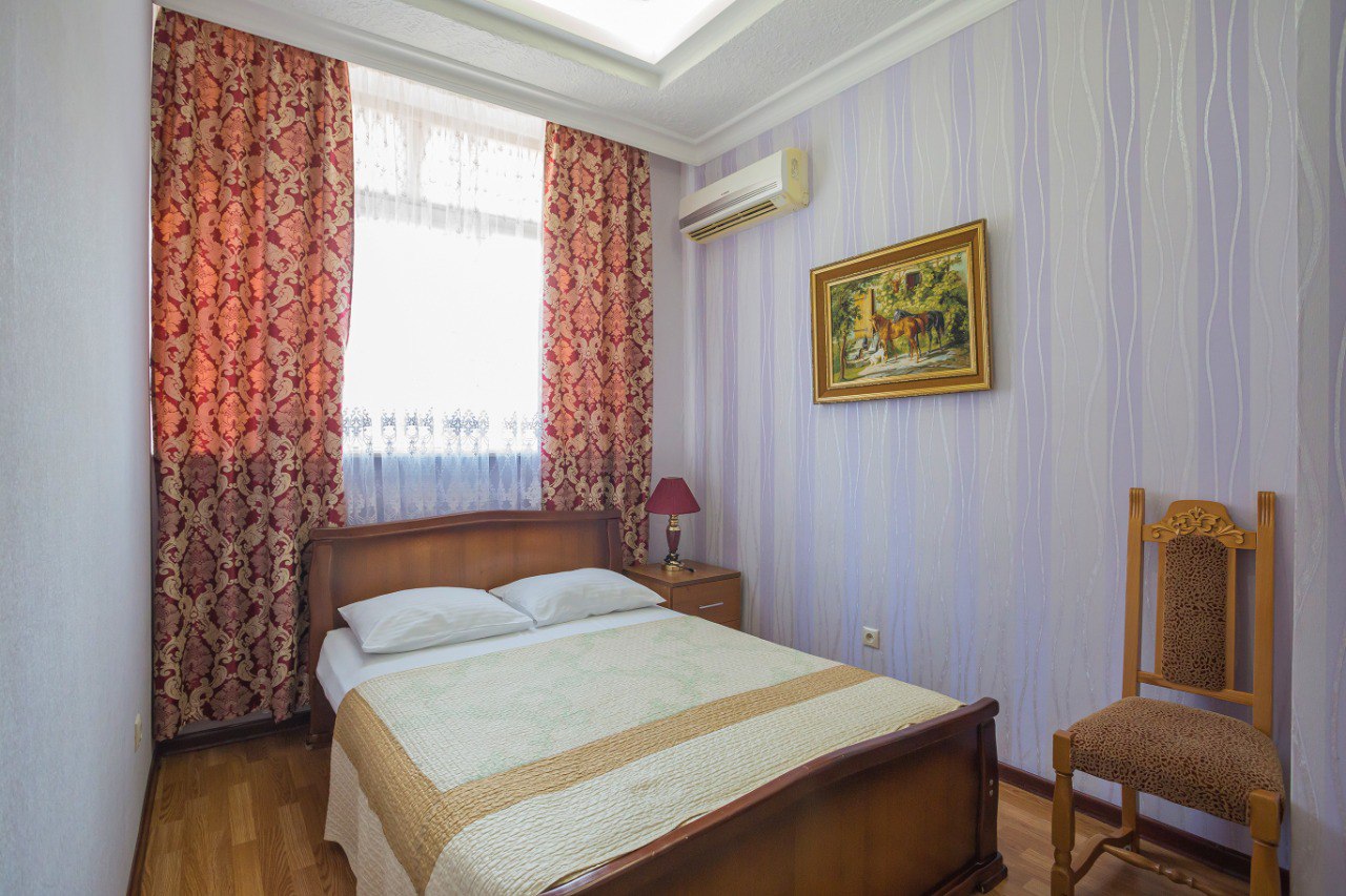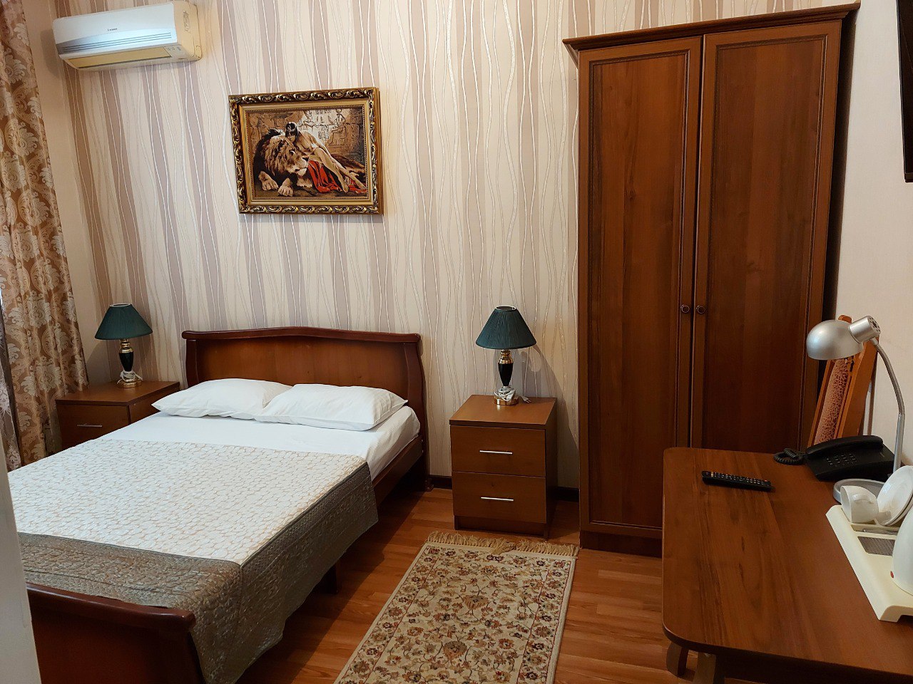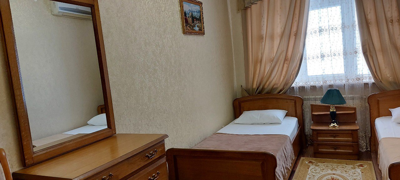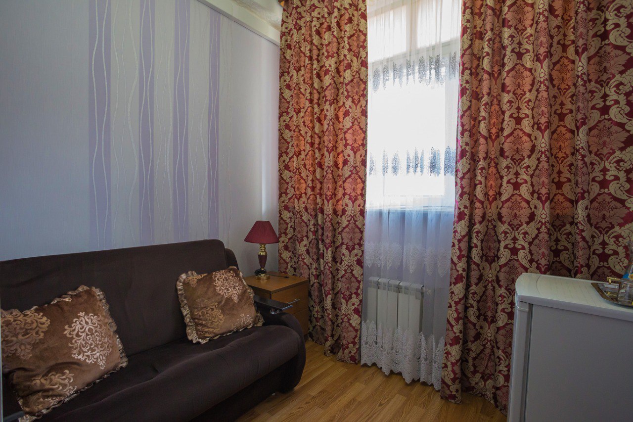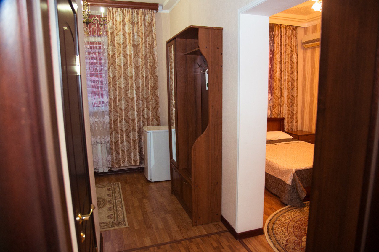 В гостинице “Тархо” вы можете забронировать двухместный номер с одной кроватью. В номере созданы все необходимые для комфортного проживания условия – есть ЖК-телевизор, холодильник и кондиционер. В ванной комнате имеются: ванна и душевая, а также средства и аксессуары первой гигиены.