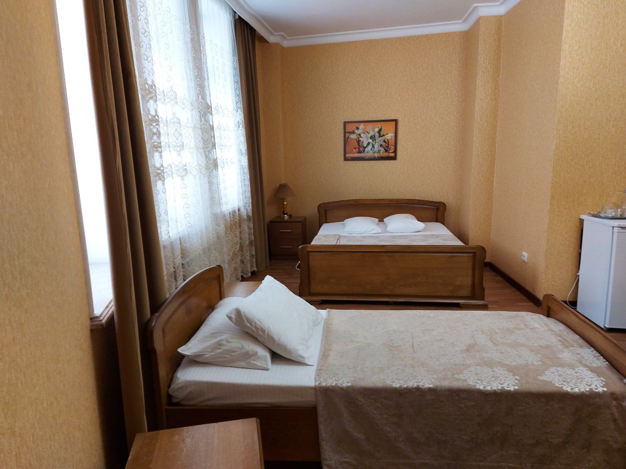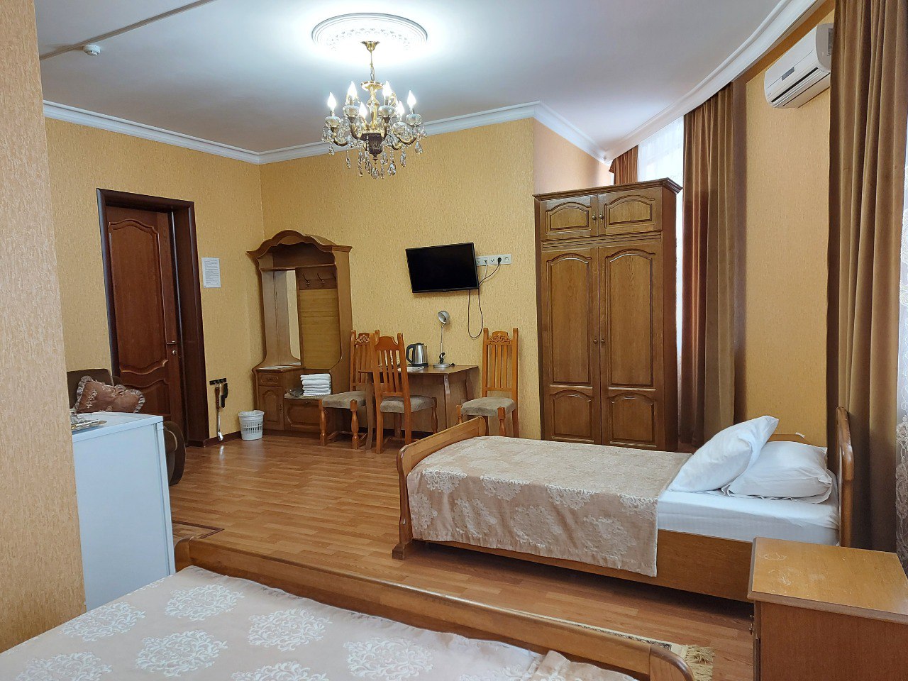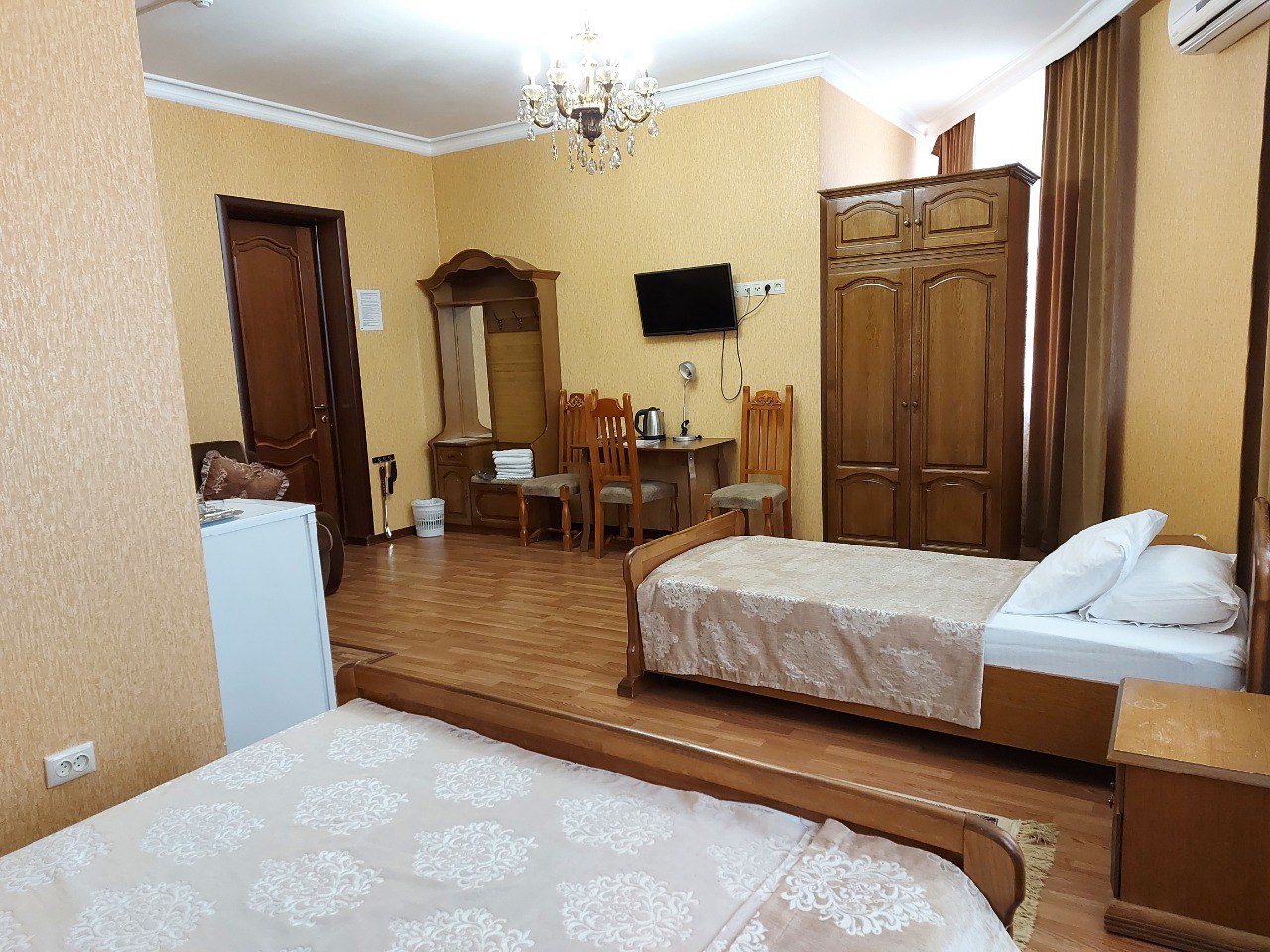 В нашей гостинице у вас есть возможность забронировать однокомнатный семейный номер. Это просторная комната с площадью 30 м². В ней предусмотрено три спальных места (двуспальная и одна односпальная кровать) плюс еще одно дополнительное (раскладной диван). В номере есть санузел с ванной, душем и туалетом, гардероб, телевизор, кондиционер, холодильник, стол, настольные лампы, телефон, сейф, одноразовые тапочки, гигиенические принадлежности, махровые изделия и фен.